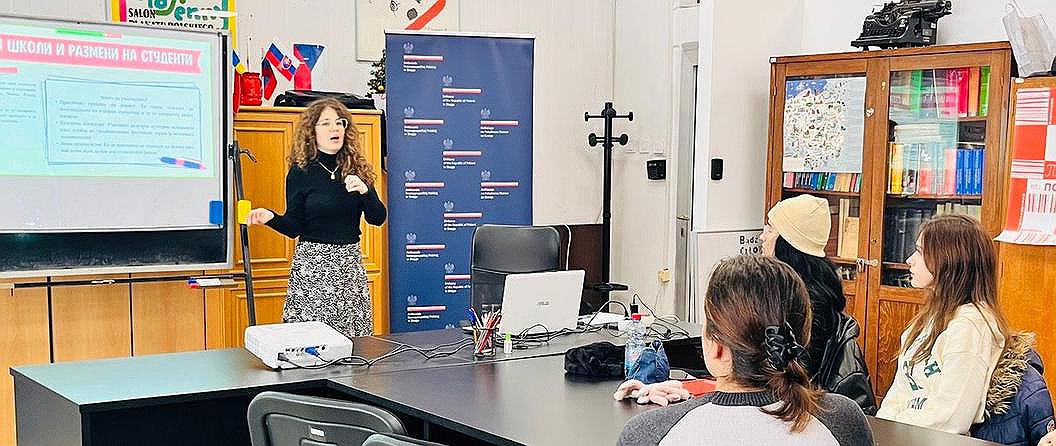 Jakie studia oferuje Wydział Filologiczny Uniwersytetu Św. Cyryla i Metodego w Skopje? Dlaczego slawistyka to ciekawy kierunek? Czy polski naprawdę jest taki trudny dla obcokrajowców? Odpowiedź na te i inne pytania przyniosła Zimowa Szkoła Slawistyczna zorganizowana na Katedrze Slawistyki 13-17 stycznia br. i skierowana do uczniów szkoł średnich, stojących przed wyborem kierunku studiów. Uczestnicy Szkoły wzięli udział w zajęciach poprowadzonych przez lektorów slawistyki. Zajęcia o Polsce i polskim języku poprowadził lektorka Natalia Łukomska. Na zakończenie projektu uczniowie otrzymali gadżety przygotowane przez Ambasadę RP w Skopje, ze specjalnie zaprojektowanym przez Panią Natalię logo, które prezentujemy poniżej.