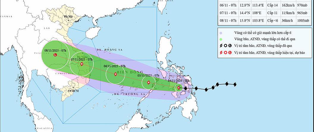 Informujemy, że według prognoz, między 6 a 7 listopada 2025 r. do wybrzeży Wietnamu ma dotrzeć tajfun "Kalmaegi", obecnie znajdujący się w pobliżu Filipin. Możliwe są ulewne deszcze i silne podmuchy wiatru. Prędkość wiatru może wynieść do około 160 km/h. Zalecamy monitorowanie sytuacji i komunikatów służb. Najprawdopodobniej burza dotknie obszaru środkowych i południowych prowincji Wietnamu.